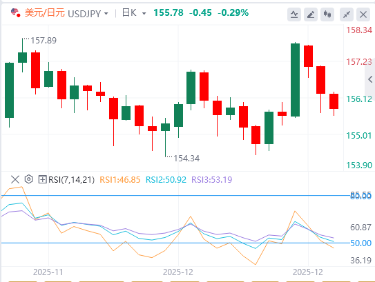 日元多头占据基本面优势,但需警惕年末流动性稀缺导致的短期波动加剧。交易者可关注154.50颈线支撑有效性,若跌破可顺势加仓做空;若反弹至158.00附近,可结合RSI超买信号布局短空。同时,需密切跟踪地缘政治动态及日本央行政策信号,以动态调整仓位。