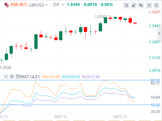九天指数移动平均线(EMA)走势高于50日均线,保持看涨偏向。英镑兑美元汇率徘徊在短期均线下方,同时远高于上升的中期均线,显示出持续的趋势支撑。此外,14天相对强弱指数(RSI)位于61.0,保持正值,未被超买。