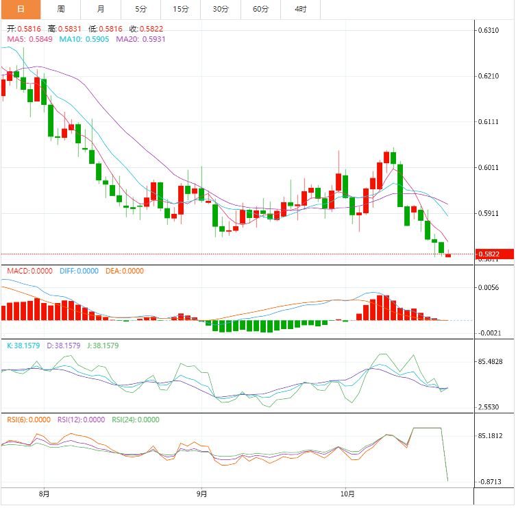 在新西兰元方面,新西兰市场因劳动节休市。上周五,新西兰9月份的贸易余额(NZD)同比下降153.3亿美元,而此前为- 155.2亿美元。新西兰统计局报告称,当月出口额从49.7亿美元降至48.7亿美元,而进口额从之前的72.4亿美元降至70.2亿美元。