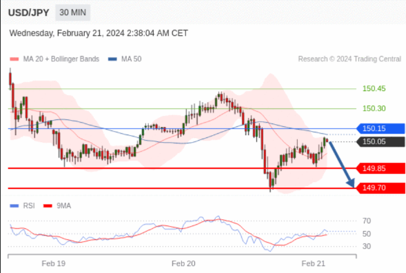 在 150.15 之下,看跌,目标价位为 149.85 ,然后为 149.70 。