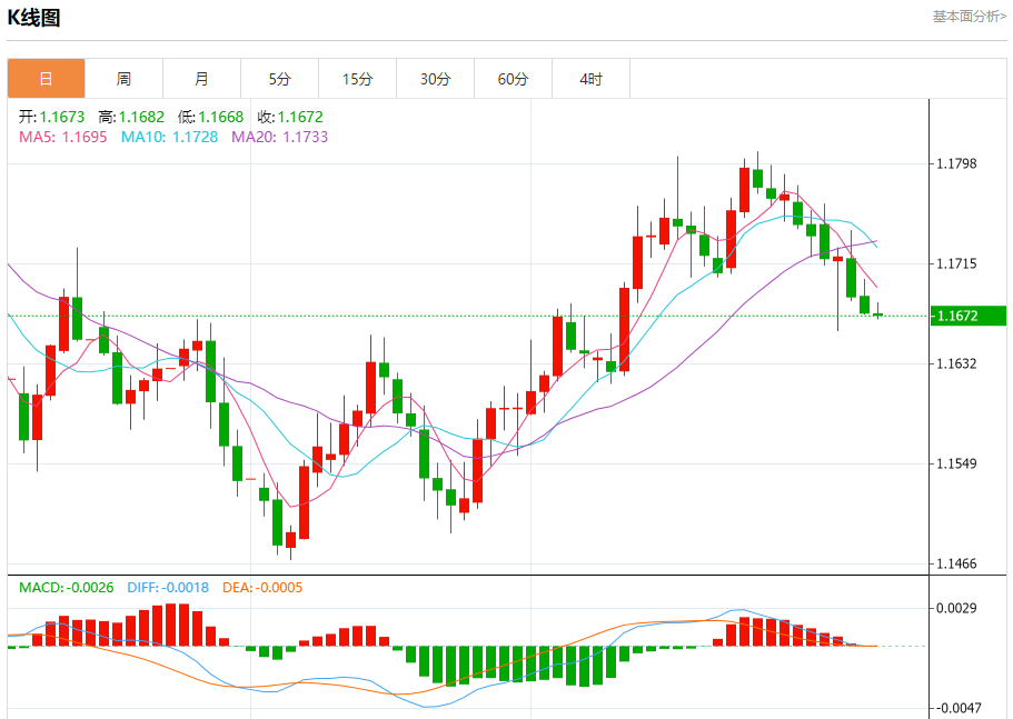 汇价高见1.1682,低见1.1668。上一交易日,汇价收于1.1674。