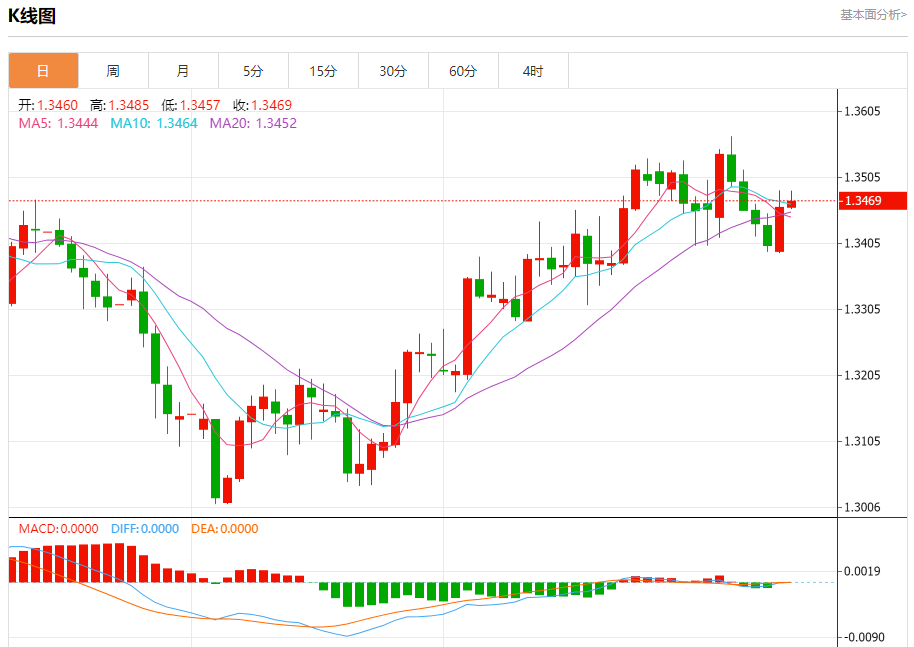 汇价高见1.3485,低见1.3457。上一交易日,汇价收于1.3460。