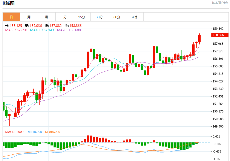 汇价高见159.036,低见157.880。上一交易日,汇价收于158.141。