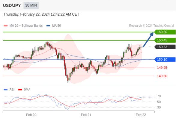 在 150.10 之上,看涨,目标价位为 150.45 ,然后为 150.60 。