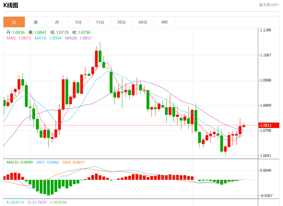 周三欧市盘中,欧元/美元最新报1.0812,日图涨0.04%.
