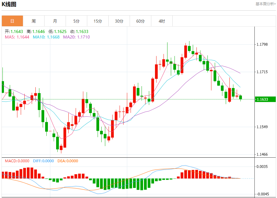 汇价高见1.1646,低见1.1625。上一交易日,汇价收于1.1643。