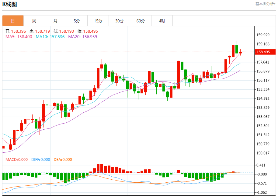 汇价高见158.719,低见158.190。上一交易日,汇价收于158.401。