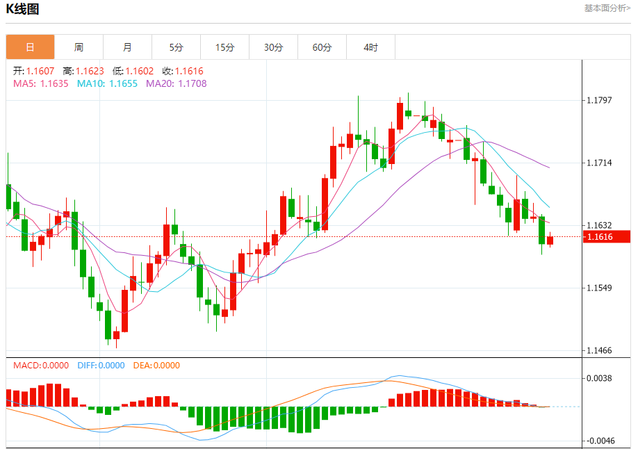 汇价高见1.1623,低见1.1602。上一交易日,汇价收于1.1607。