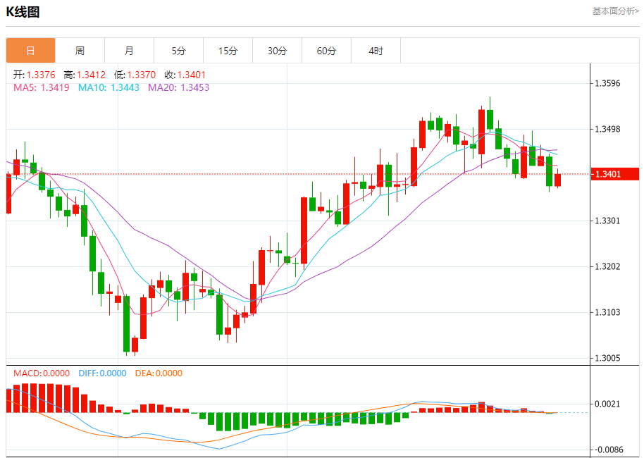 汇价高见1.3412,低见1.3370。上一交易日,汇价收于1.3376。