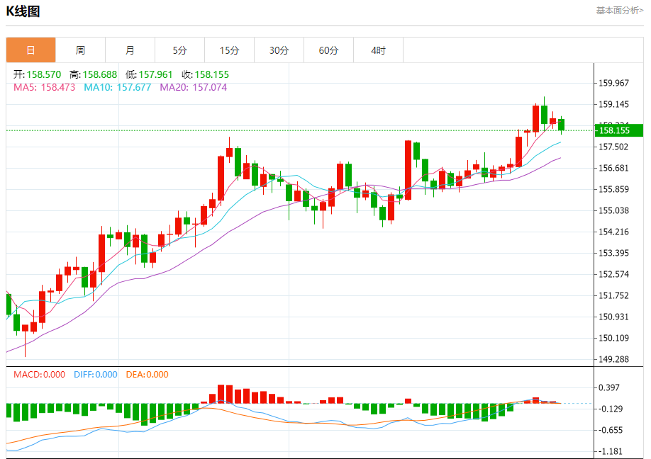 汇价高见158.688,低见157.961。上一交易日,汇价收于158.597。