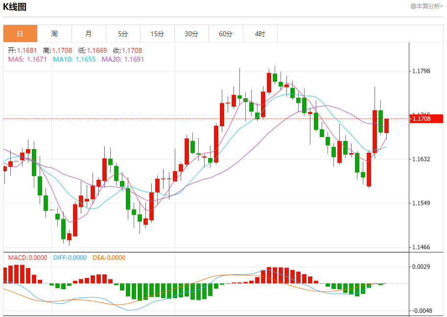 汇价高见1.1708,低见1.1669。上一交易日,汇价收于1.1683。