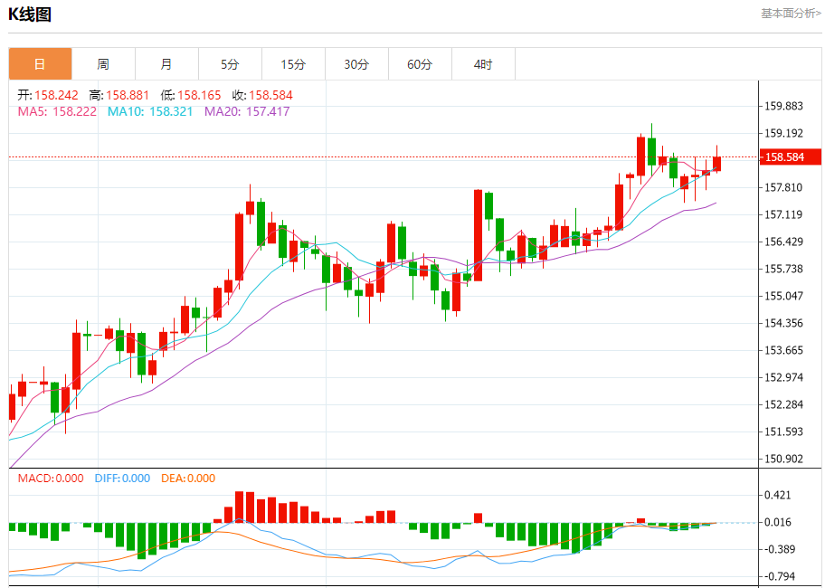 汇价高见158.881,低见158.166。上一交易日,汇价收于158.249。
