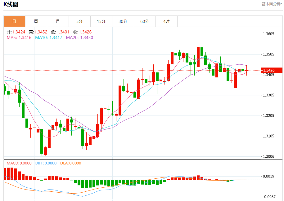 汇价高见1.3452,低见1.3401。上一交易日,汇价收于1.3424。