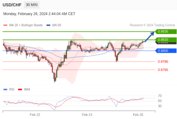 在 0.8800 之上,看涨,目标价位为 0.8820 ,然后为 0.8835 。