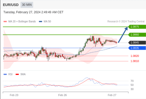 在 1.0835 之上,看涨,目标价位为 1.0860 ,然后为 1.0875 。