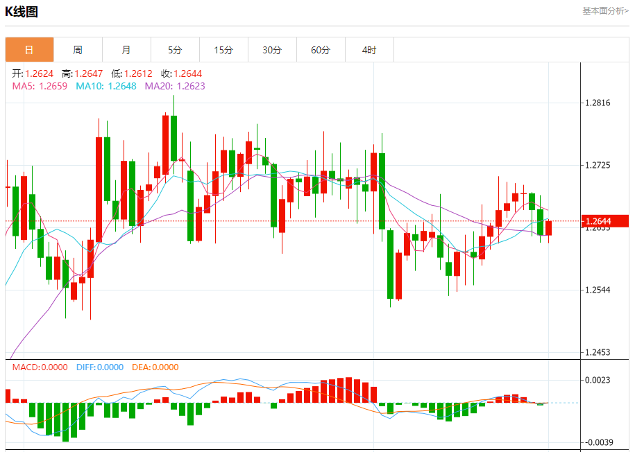 汇价高见1.2647,低见1.2612。上一交易日,汇价收于1.2624。