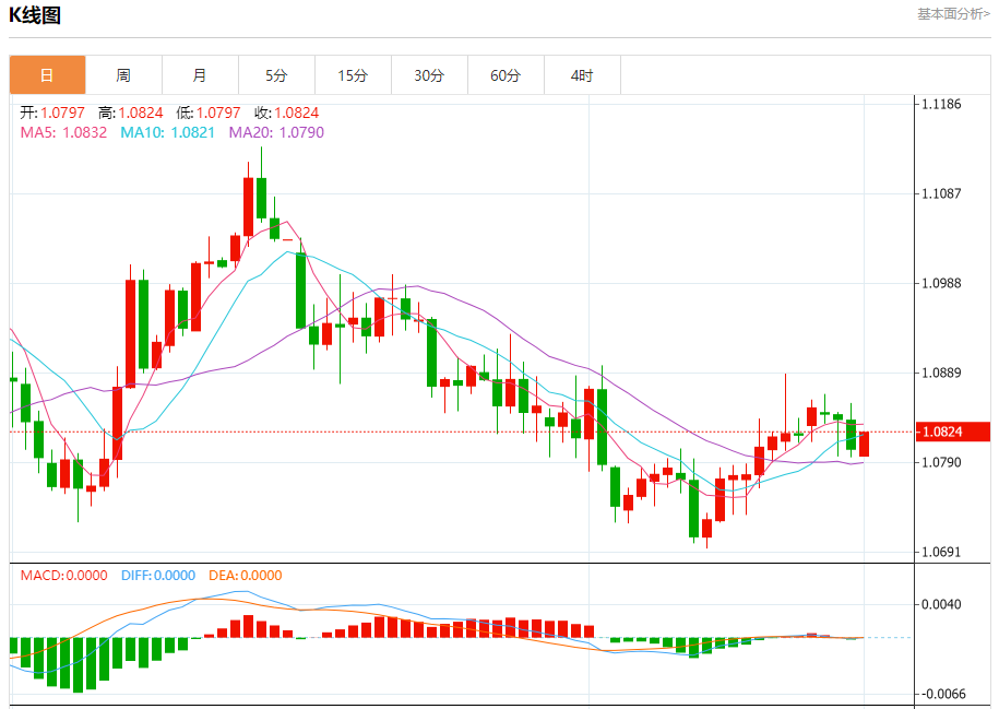 汇价高见1.0824,低见1.0797。上一交易日,汇价收于1.0805。