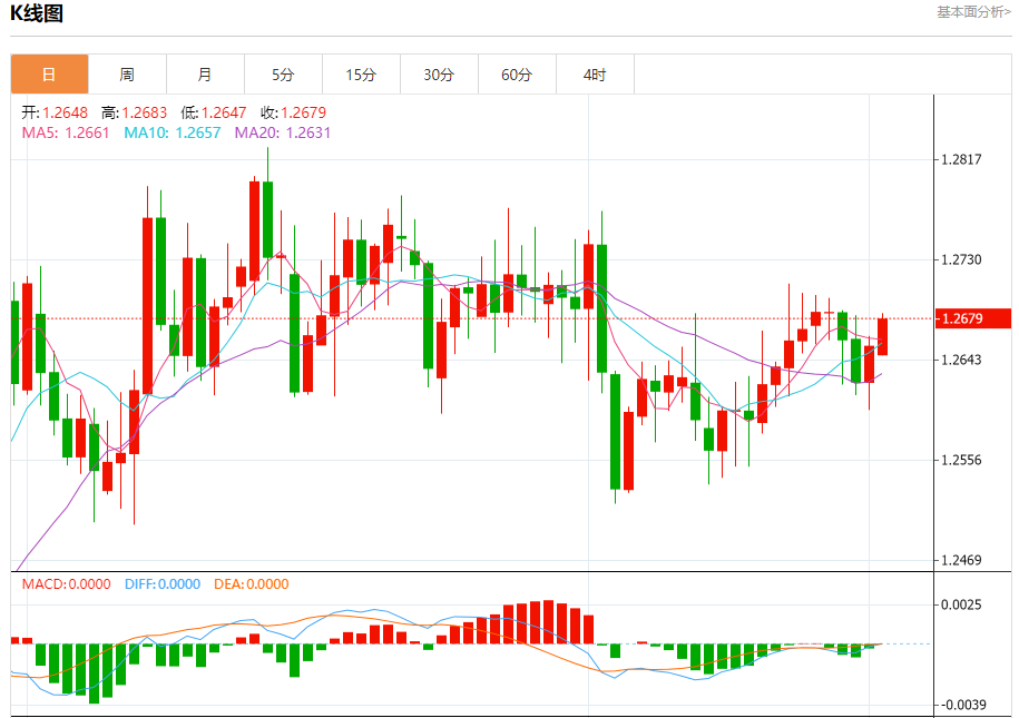 汇价高见1.2683,低见1.2647。上一交易日,汇价收于1.2655。