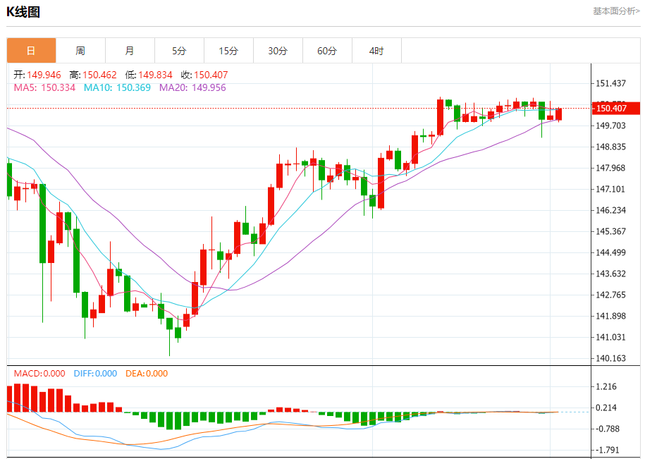 汇价高见150.461,低见149.834。上一交易日,汇价收于150.116。