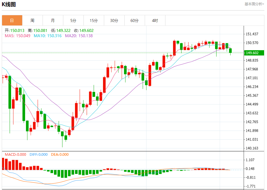 汇价高见150.081,低见149.322。上一交易日,汇价收于150.037。