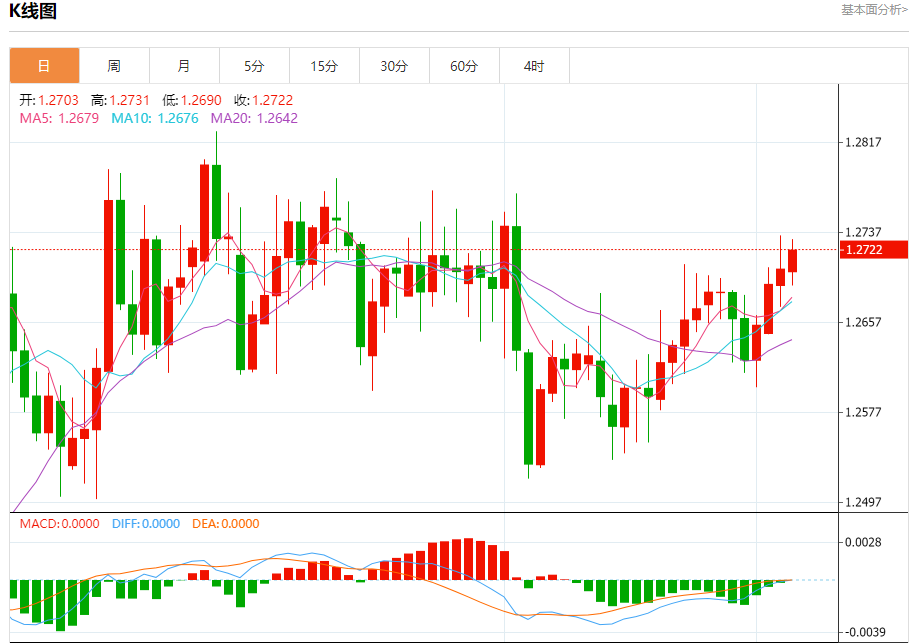 汇价高见1.2731,低见1.2690。上一交易日,汇价收于1.2705。
