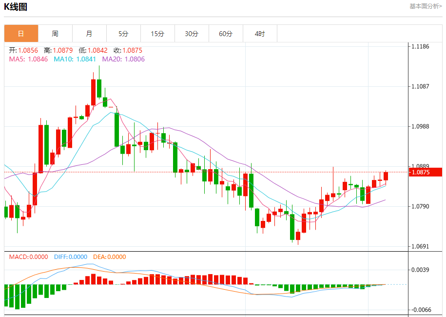 汇价高见1.0879,低见1.0842。上一交易日,汇价收于1.0856。