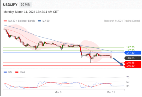 在 147.30 之下,看跌,目标价位为 146.45 ,然后为 146.20 。