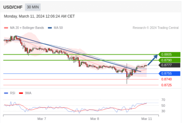 在 0.8755 之上,看涨,目标价位为 0.8790 ,然后为 0.8805 。