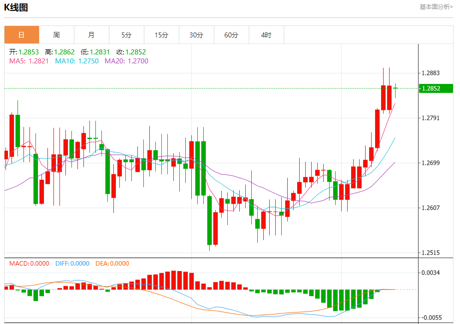 汇价高见1.2862,低见1.2831。上一交易日,汇价收于1.2853。
