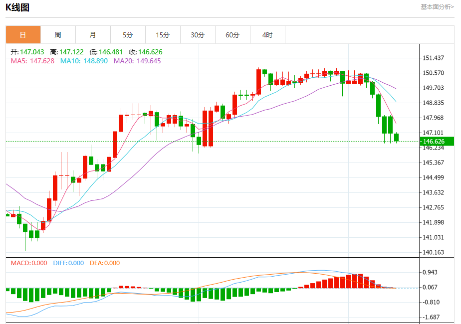汇价高见147.122,低见146.481。上一交易日,汇价收于147.046。