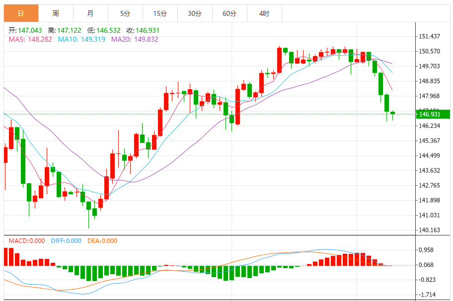 周一(3月11日),美元/日元下跌,暂报146.954,跌幅0.07%。