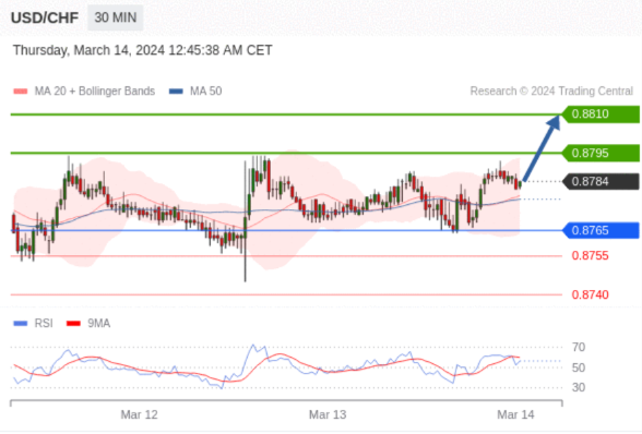 在 0.8765 之上,看涨,目标价位为 0.8795 ,然后为 0.8810 。