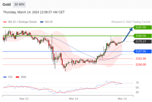 在 2167.00 之上,看涨,目标价位为 2180.00 ,然后为 2187.00 。