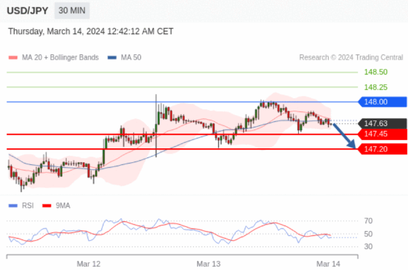 在 148.00 之下,看跌,目标价位为 147.45 ,然后为 147.20 。