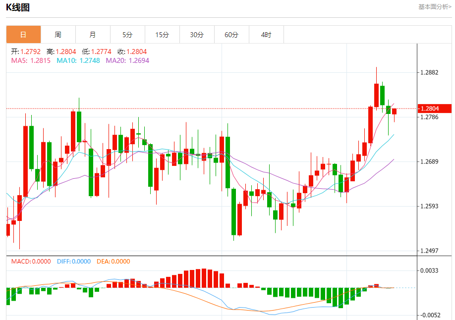 汇价高见1.2804,低见1.2774。上一交易日,汇价收于1.2793。