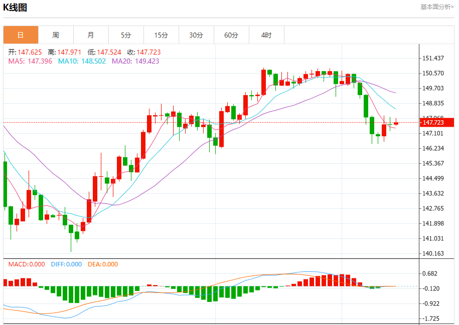 汇价高见147.971,低见147.524。上一交易日,汇价收于147.623。