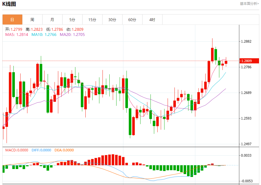 汇价高见1.2823,低见1.2786。上一交易日,汇价收于1.2798。