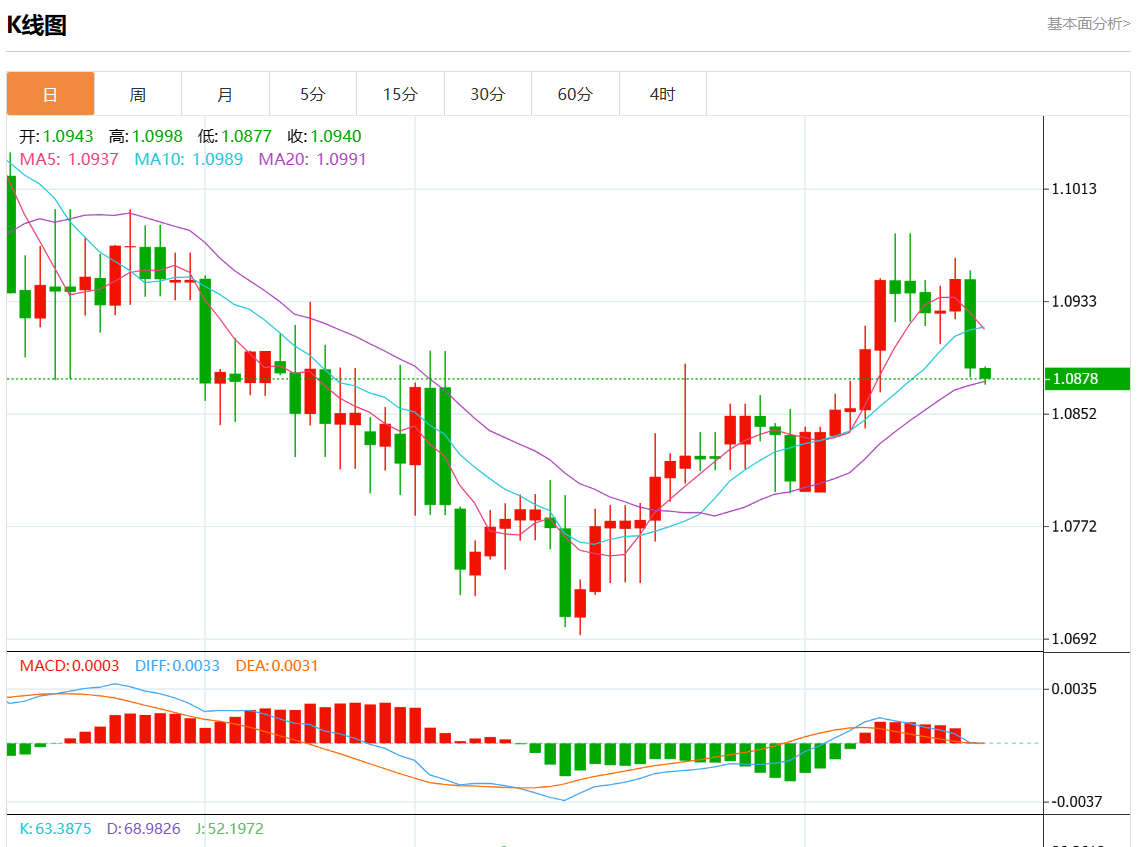 周五欧市盘中,欧元/美元最新报1.0877,日图跌0.07%.