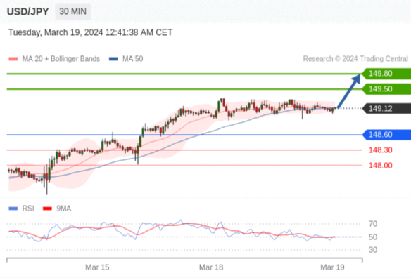 在 148.60 之上,看涨,目标价位为 149.50 ,然后为 149.80 。