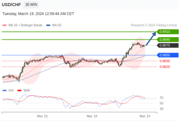 在 0.8850 之上,看涨,目标价位为 0.8890 ,然后为 0.8910 。