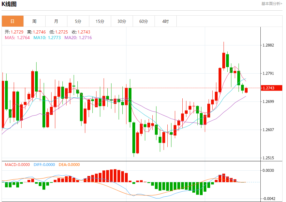 汇价高见1.2746,低见1.2725。上一交易日,汇价收于1.2735。