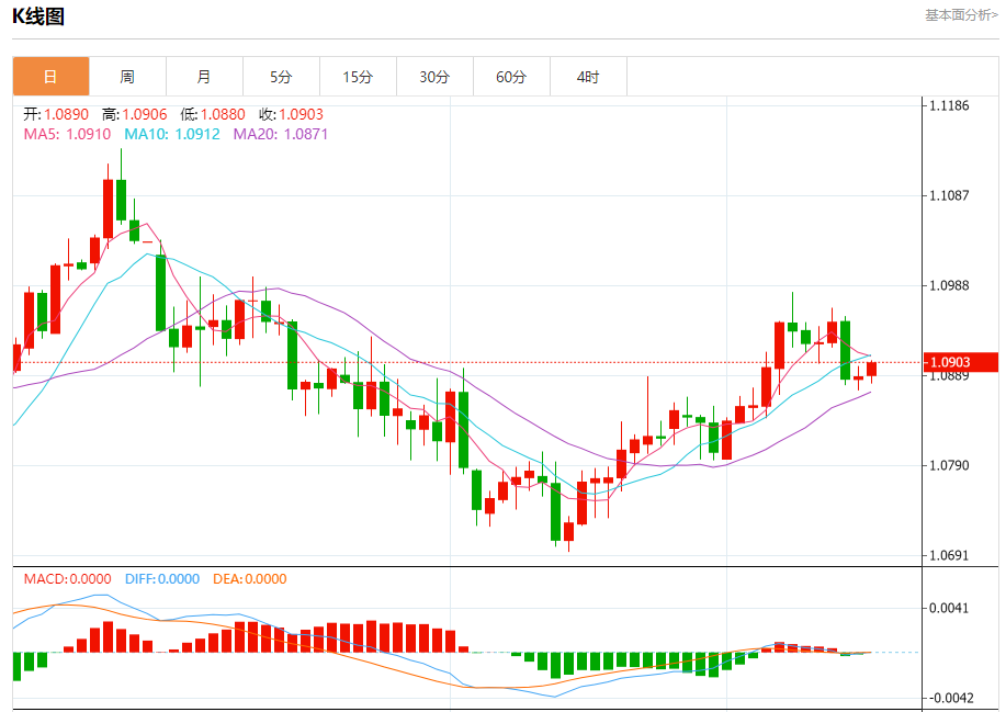 汇价高见1.0906,低见1.0880。上一交易日,汇价收于1.0888。