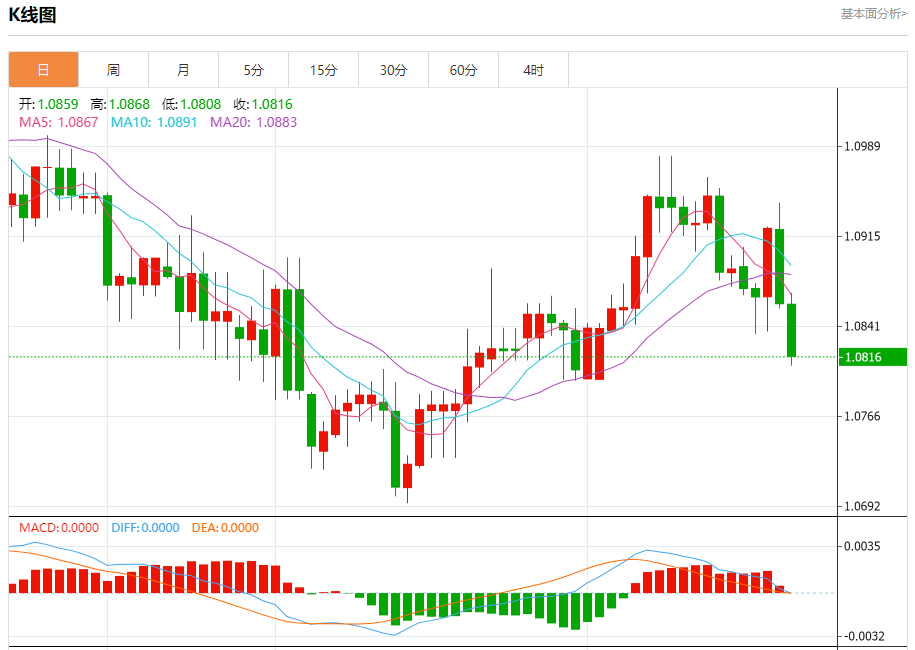 汇价高见1.0868,低见1.0808。上一交易日,汇价收于1.0859。