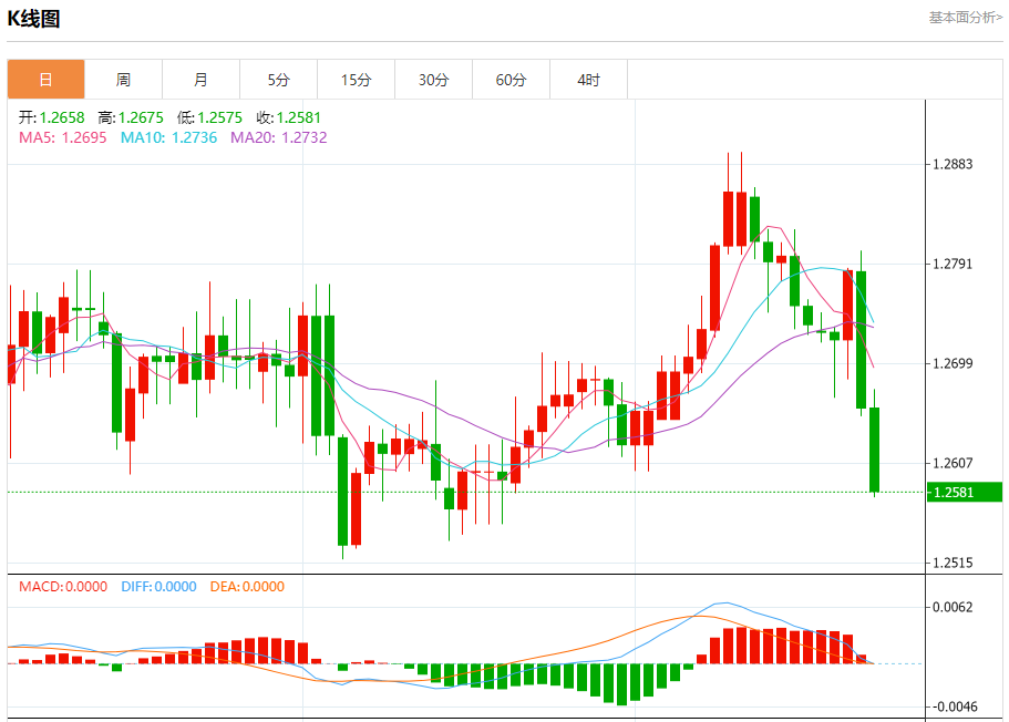 汇价高见1.2675,低见1.2575。上一交易日,汇价收于1.2657。