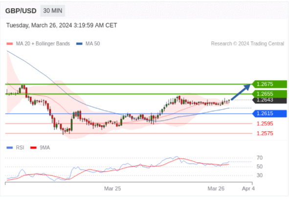 在 1.2615 之上,看涨,目标价位为 1.2655 ,然后为 1.2675 。