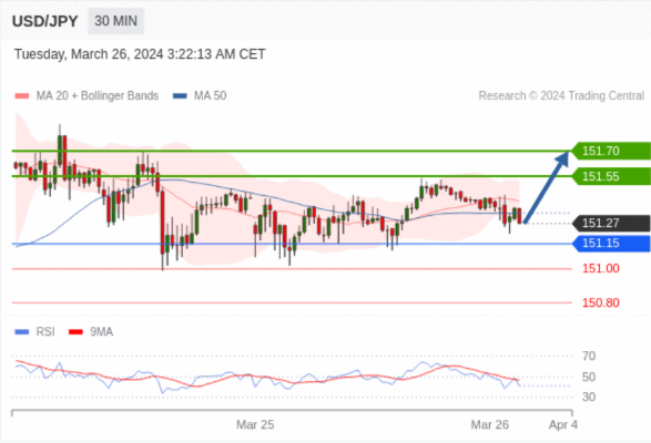 在 151.15 之上,看涨,目标价位为 151.55 ,然后为 151.70 。