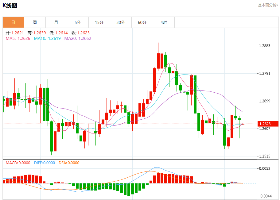 汇价高见1.2640,低见1.2614。上一交易日,汇价收于1.2637。