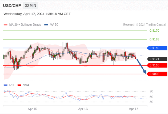 在 0.9140 之下,看跌,目标价位为 0.9110 ,然后为 0.9095 。