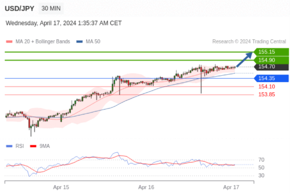 在 154.35 之上,看涨,目标价位为 154.90 ,然后为 155.15 。
