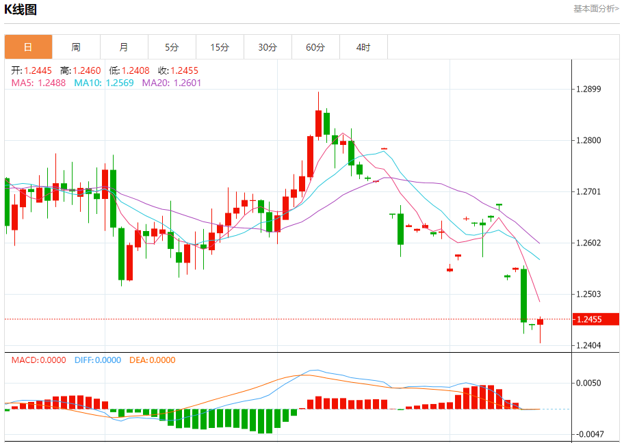 汇价高见1.2460,低见1.2408。上一交易日,汇价收于1.2446。